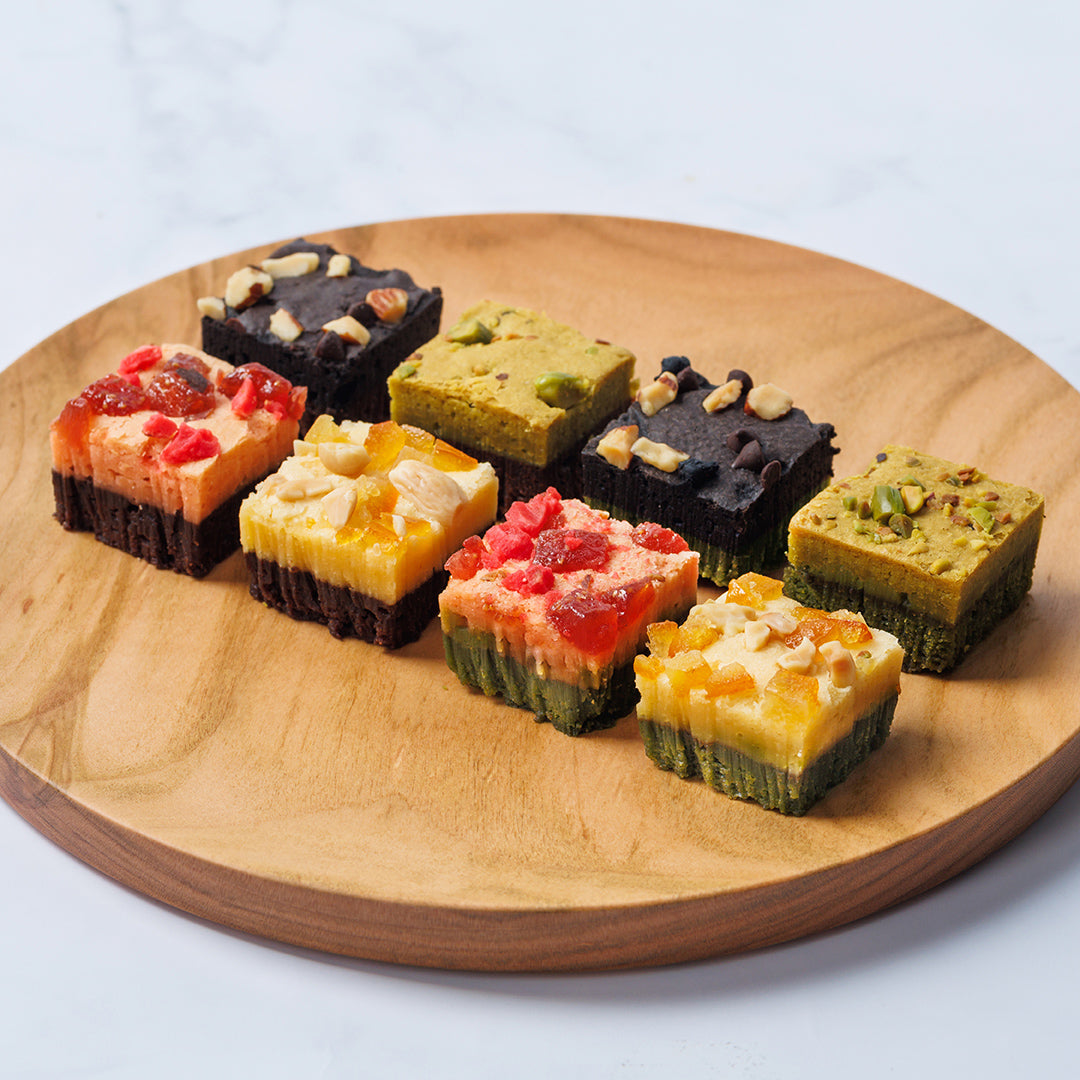 【抹茶ブラウニー×ピスタチオクッキー】抹茶ブラウニー(砂糖、小麦粉、バター、マーガリン、鶏卵、はちみつ、抹茶加工品)(国内製造)、ピスタチオ、小麦粉、バター、粉糖、加糖卵黄、ピスタチオペースト/膨張剤、着色料(クチナシ、カロチノイド)、乳化剤、香料、酸化防止剤(V.E)、(一部に小麦・卵・乳成分・大豆を含む)