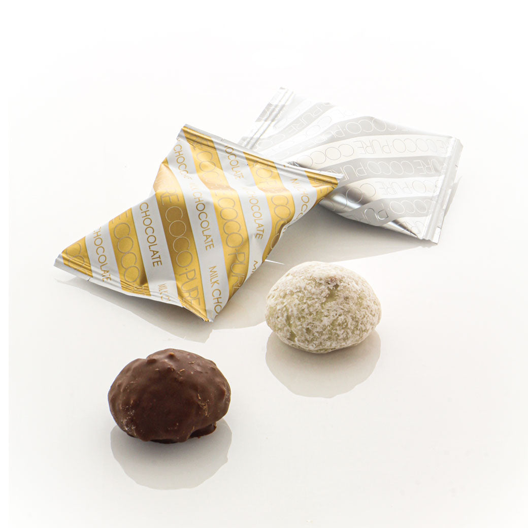 《ピュアココ ミルク》チョコレート(ベルギー製造)、鶏卵、小麦粉、マーガリン、牛乳、チーズパウダー、砂糖、食塩、こしょう/乳化剤、香料、着色料(カロチン)、(一部に小麦・卵・乳成分・大豆を含む)