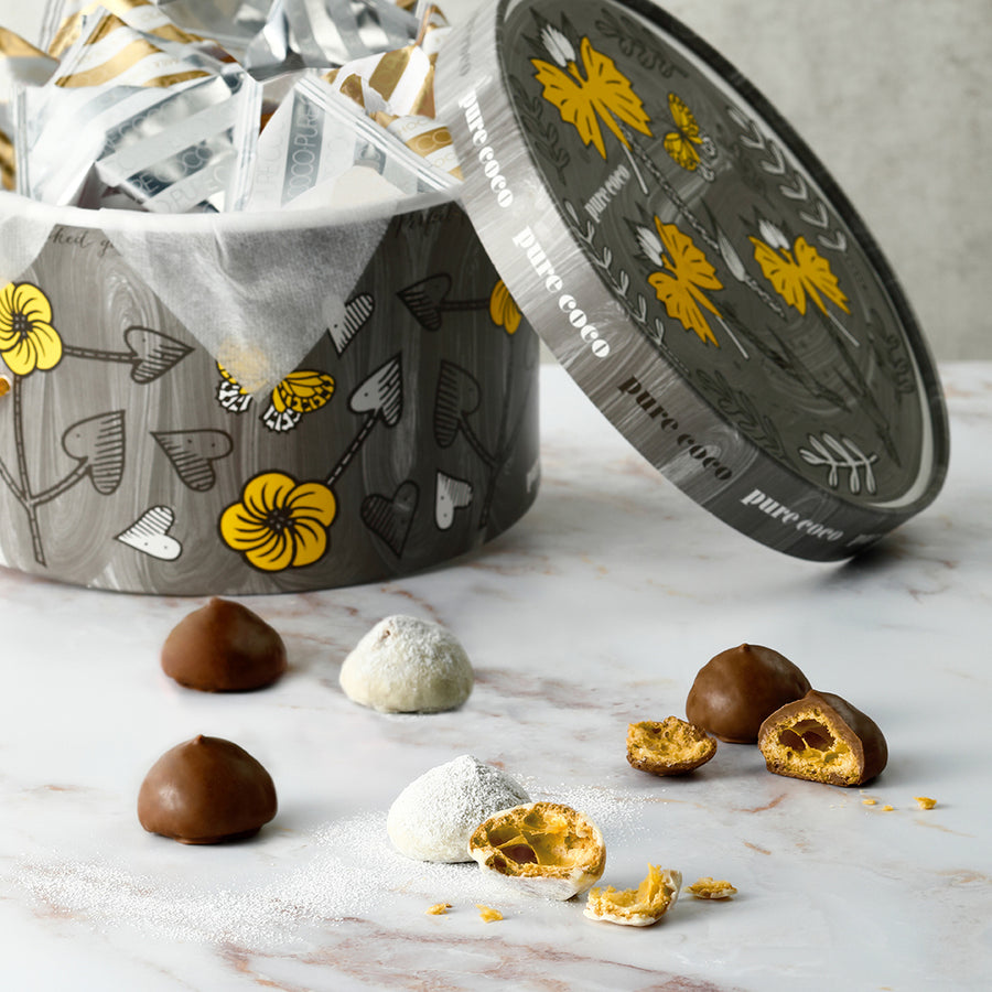 サクサクのシュー生地にパウダーシュガーとホワイトチョコレートをまとわせた「ピュアココ ホワイト」と、ミルクチョコレートをコーティングした「ピュアココ ミルク」が入ったアソートセットです。